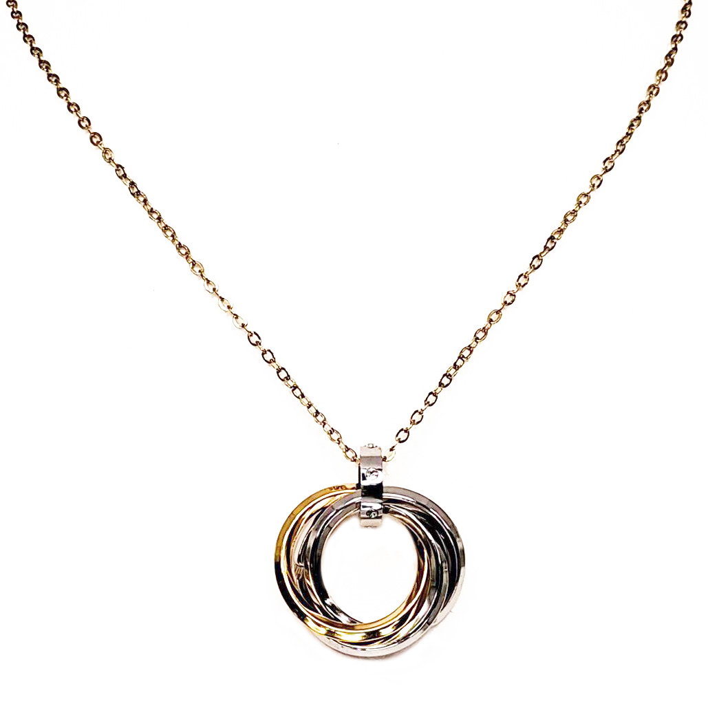 Μενταγιόν με λεπτή επιχρυσωμένη ατσάλινη αλυσίδα και στοιχείο τρεις αλληλένδετους κρίκους, που συμβολίζουν το παρελθόν, το παρόν και το μέλλον, σε χρυσό και ασημί περασμένους από μια ιδιαίτερη ροδέλα με διακριτικά ζιρκόν